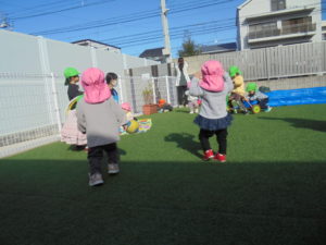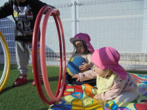 他のクラスのお友だちとも関わりながら、ボールやフープ、追いかけっこなど