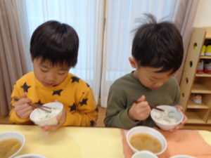 先生に「7つの野菜が入ってるよ!」「胃を休めるために食べるんだよ。」と話を聞いて、子どもたちはおかゆの中の大根を探しながら食べていましたよ(笑)