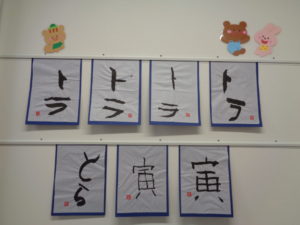 3歳児さんはカタカナで「トラ」、4歳児さんは平仮名で「とら」、5歳児さんは漢字で「寅」と書きました。