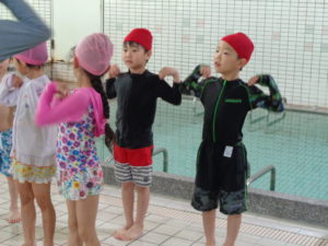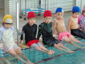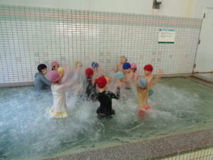 カニ歩きでは手すりを伝ってプールサイドを移動していくのですが、途中からは踏み台がなく、子どもたちの頭のてっぺんが浸かるほどの水深になっています…