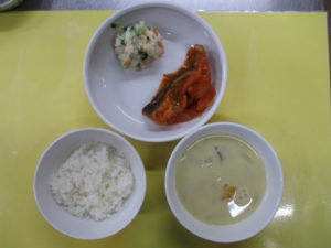 みんなが大好きな給食です。上手にスプーンや器を持って、今日もおかわりしてすべて完食しましたよ。
