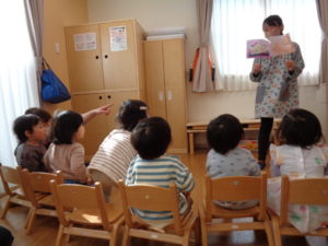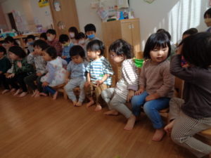 「きゃべつの中から」の手遊びをみんなで楽しんだ後は、ひなまつりクイズがありました。