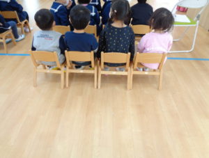 先生のお話をよく聞いて、立つ練習、おじぎや歌など。。。