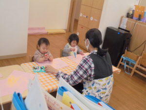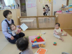 今日のいちご組さんは、お部屋でゆったりと好きな遊びを楽しんでいます。