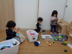 製作の後は、めろん組さんのお部屋で遊びました。みんな目を輝かせ、おままごとや電車で線路をつないだりと夢中!