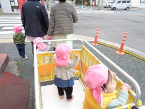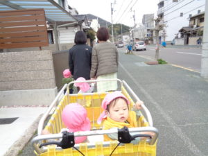 お散歩車にも慣れ、立ち乗りで見る景色を楽しむ子、先生と手を繋ぎ、上手に歩けるようになった子・・・