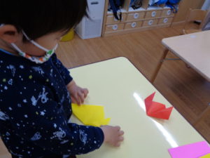 3歳児になったお友だちは、初めて折り紙の製作をしました!