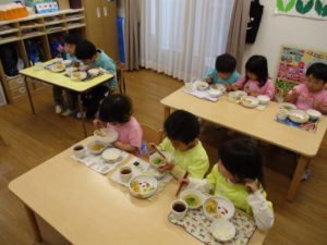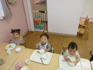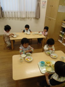 新しく入ったお友だちも先生たちと一緒に、頑張って食べています😉