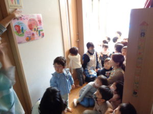 火災発生の合図があると遊んでいたそら組さんは保育者の話を聞き落ち着いて避難することができていました。今日は雨が降っていたので廊下に避難をしました。