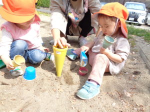 スコップですくうのも上手になってきて、ままごとあそびの幅もどんどん広がっています。