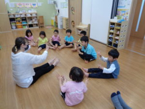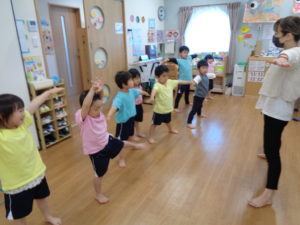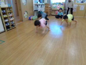 クマさん歩きもしました。踊るだけではなく、いろいろな動きを楽しみながら取り組んでいました。
