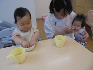 朝のおやつは、月齢に合わせて、お茶をスプーンで飲ませてもらったり、自分でボーロを食べたり、それぞれ満足そうにしていました。