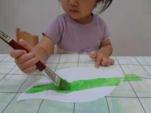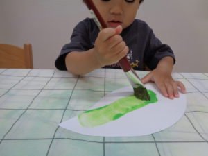 筆を持ってスナップえんどうに色塗りしましたよ。上手に用紙に手を添えたる姿がとってもかわいいですよね。