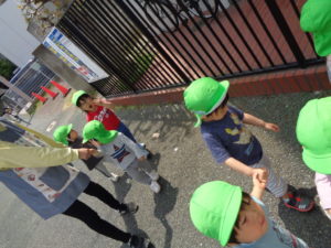 製作の後は、仲良く手を繋いで八幡神社へ出発!自分で帽子を被り、靴を履いている姿に成長を日々感じます。