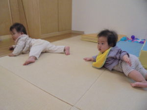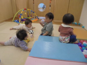 ボールを握ったり、保育室内をずり這いや寝返りをして移動したりと楽しんでいます。