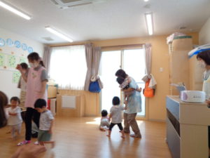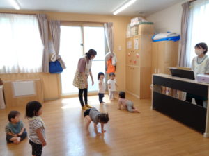 わらべうたの後は、雨の日のお散歩をイメージして「いっちに、いっちに」と歩きました。