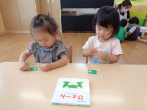 かえるさんの絵本を見て、自分のかえるさんにおめめやほっぺをシールで貼ったり、口を描いたりしましたよ🐸❤