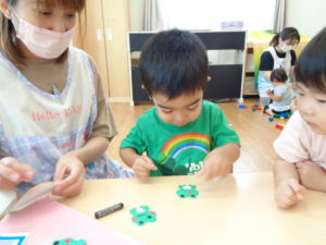 4月生まれのお友だちは、目の部分とほっぺの位置が分かり一人で貼ることができました!