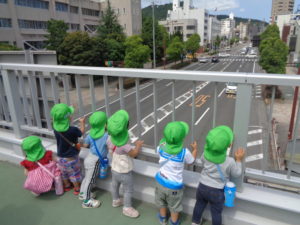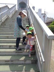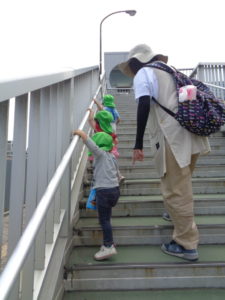 今日のめろん組さんは、歩道橋をぐるっと渡って近くの公園へお出かけしましたよ。上手に手すりを持ち、「よいしょ、よいしょ」と一人で頑張って上がれるようになりました。