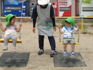「一緒にブランコ乗ろう」とお友だちを誘ってゆらゆら満足笑顔。
