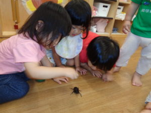 遊び以外では、カブトムシに触れたり、蝉取りに行って観察したりして夏の昆虫に興味津々の子どもたち。