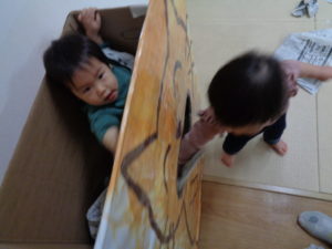 お魚の乗り物に、新聞紙を入れていたけれど、中に乗りたくなって、順番に乗って遊びました。