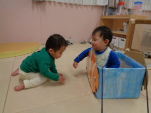 お友だちの乗り物をひっぱってあげる子も何人かいました。手足の力もつよくなり、保育者もびっくりです。
