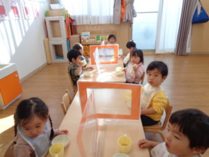 今日のひまわりぐみさんは、いつものおやつタイムからスタートです。落ち着いて、椅子に座って上手に食べれるようになった子どもたちです。