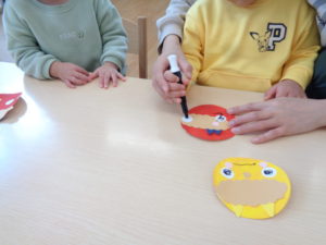 鬼のつのはどこかな、目・鼻・口はどこかなと、それぞれがイメージをもち、指先を器用に使って製作をすることができていましたよ。個性豊かな、可愛らしい鬼に仕上がりました👍