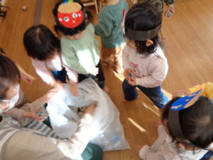 鬼はこわい~、どうやって作るのかなと、興味津々で聞いていましたが、やっぱり鬼はこわくて背を向けてしまう子どももいました(笑)