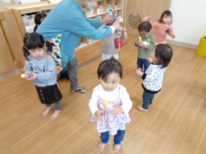 「おもちゃのチャチャチャ」の音楽に合わせてリズムよく振ります(^^♪