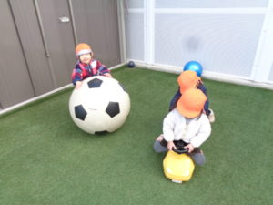 大きなボールを転がしたり、車に乗っているお友だちを押してあげたり