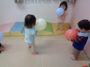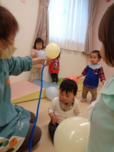 風船を膨らむ様子をみんなで見て、ドキドキしています。