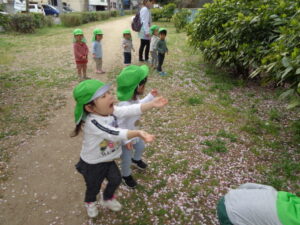公園にいくと、桜の花びらが落ちてくるのを手のひらでつかもうと、追いかけていました。