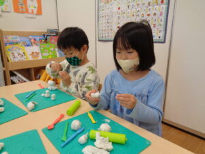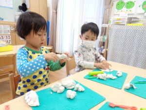 3・4歳児さんは、お部屋で粘土遊びをしました。