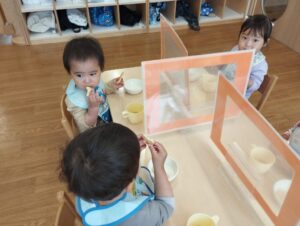 お外に行く前に、おやつを食べたり、朝の会をしたりして、ひまわりぐみの一日が始まります😮