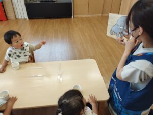 給食前に、みんなが大好きな絵本「もりのおふろ」を読みました。