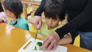 到着したら施設の方のお話を聞いて、みんなで一緒にピザづくり開始!!