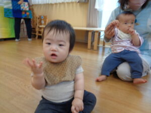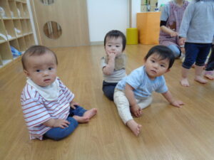 「はーい」と一緒に返事をしているひまわり組の子どもたちの元気な声を聞いていたいちご組もお友だち。