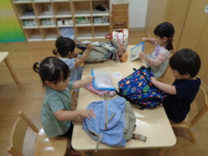 リュックサックの中から自分の荷物を取り出し、決まったところにエプロンやタオル・帽子などを片づけする作業をします。進級当初は、どのようにしたらよいのかわからなかったのですが、今では順番を覚え、スムーズに行うことができています。日々の積み重ねが大切なのだと、実感させられます。