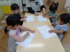 今日はちょっと難しいワークをしました😊上から下へと、直線を書く練習をしました。始めは保育士のお話を聞きます。その後に、クレヨンを使って書いてみましたよ。なかなか難しくうまくいかない子もいましたが、何回か書いているとうまく書けるようになってきていました。今後も、練習を続けていこうと思います。