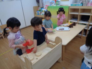 みんなでおままごとで遊びました。赤ちゃんに「ごはんだよ~」とお母さんになり食べさせたり、「先生のお弁当つくるよ」とおいしそうなお弁当を作ってくれました。そのあとは、「コーヒーどうぞ」とコーヒーまでいただきました(笑)