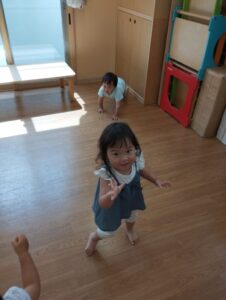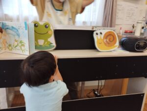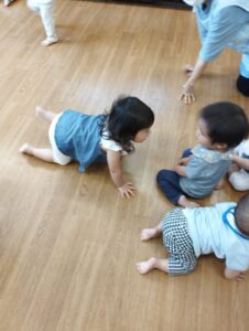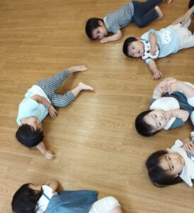 リトミックでは、カエルやカタツムリになって、歌に合わせて歩いたよ🐸🐌