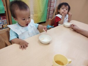 保育者の真似をして身体を伸ばしたり、絵本を見たりして過ごしました。