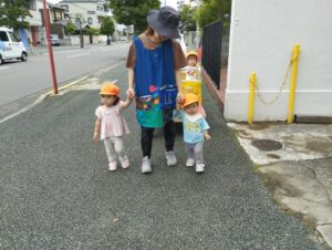 おやつを食べて、朝の会を終えたら大好きなお散歩の時間です。