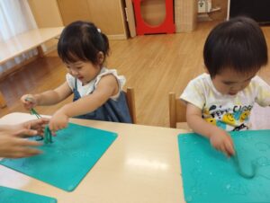 ねんど遊びでは、丸く広げて粘土板にぺったんとしてみたり