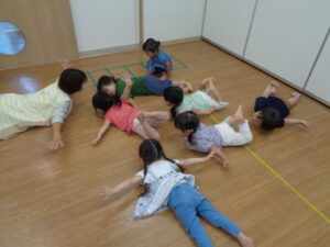 ヘリコプターや飛行機に変身し、みんな上手にバランス良くジャンプしたり、左右に体をゆらゆら。