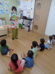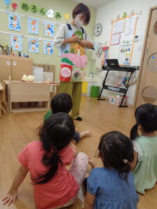 次は「ピーマンマンのいただきます」のエプロンシアターを楽しみましたよ。