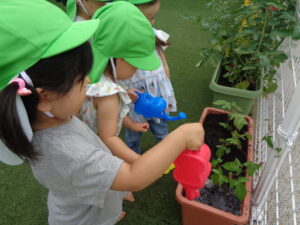 みんなで協力して土を入れ、「大きくなってね。」と声をかけながら水やりをしました。ふと隣のトマトを見ると、小さな青い実がいくつかついていました。みんなとても喜び、収穫が待ち遠しいようでした🍅
