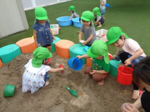 大胆に泥で遊ぶ子もいれば、少しずつ触ってみる子もいました。とろとろでひんやりとした感触を楽しみながら、ジュース屋さんごっこや川づくりをしました。気がつくと全員が夢中になって泥遊び!